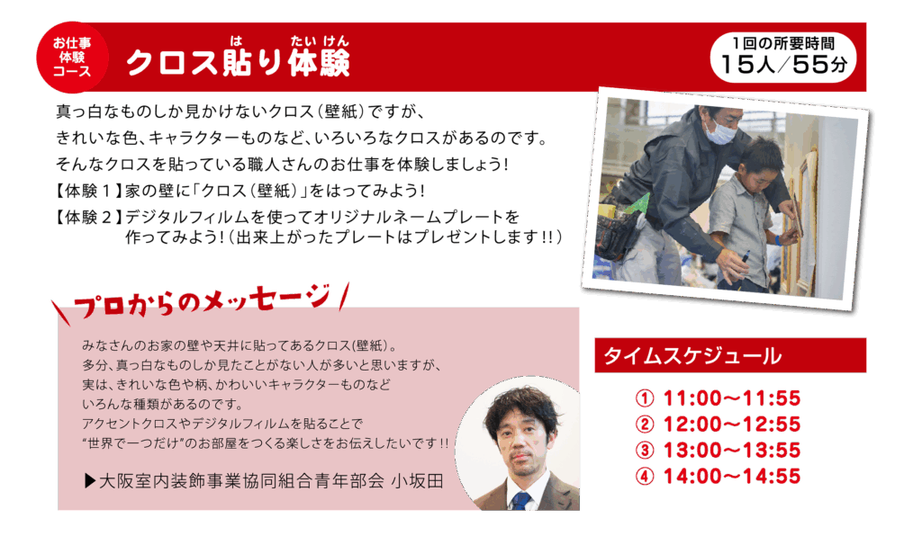 体験 住 まいの簡単修繕体験 左官屋 さん体験 大工 さん体験 建築士 (設計士 )体験 「 見 えないところにある大切 なモノ」水道工事体験 介護 のお仕事体験 予約 なしで体験 できるブースです!